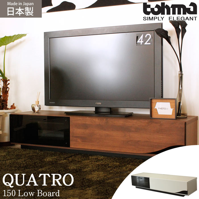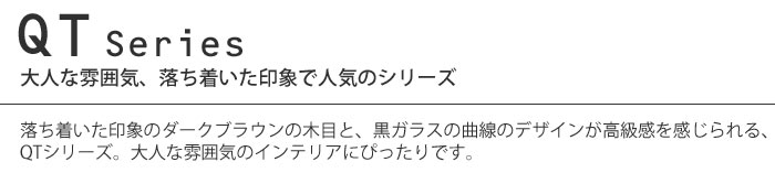 予めご了承くださいませ商品 QT 150 ローボード サイズ(約) 幅1500mm × 奥行420mm × 高さ300mm 素材 ブラウン/天板:含浸紙、側面:プリント紙化粧合板、前板:アルダー天然木(ウレタン塗装) ホワイト/MDF(ウレタン鏡面塗装)、強化ダークグレーガラス 耐荷重 天板:静止耐荷重/約60kg 生産 日本 完成品 - 備考 落ち着いた印象のダークブラウンの木目と、黒ガラスの曲線のデザインが高級感を感じられる、QTシリーズ。