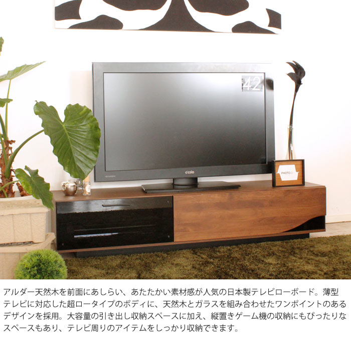 薄型テレビに対応した超ロータイプのボディに、天然木とガラスを組み合わせたワンポイントのあるデザインを採用。